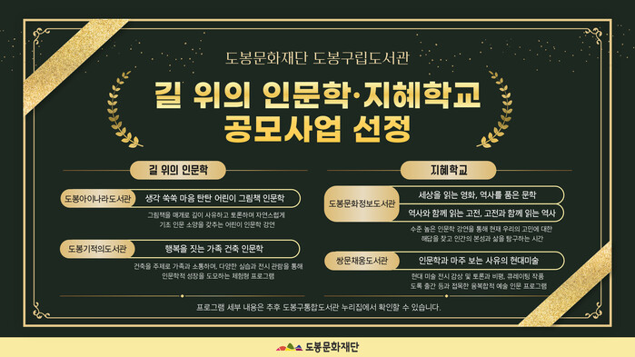 [시민일보 = 문민호 기자] 도봉구(구청장 오언석) 구립도서관 4곳이 문화체육관광부가 주최하고 한국문화예술위원회가 주관하는 ‘길 위의 인문학 및 지혜학교’ 공모사업에 선정됐다.