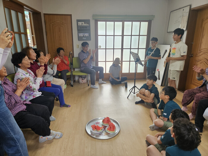 이어서 안계마을 경로당을 찾아 준비한 공연을 발표하며 어르신들과 따뜻한 정을 나눴다. 노래와 율동, 악기 연주 등 다양한 프로그램이 어르신들의 얼굴에 웃음을 안겼고, 학생들 또한 진심을 담아 어르신들께 시간마다 열심히 배웠 감사의 마음을 전했다.