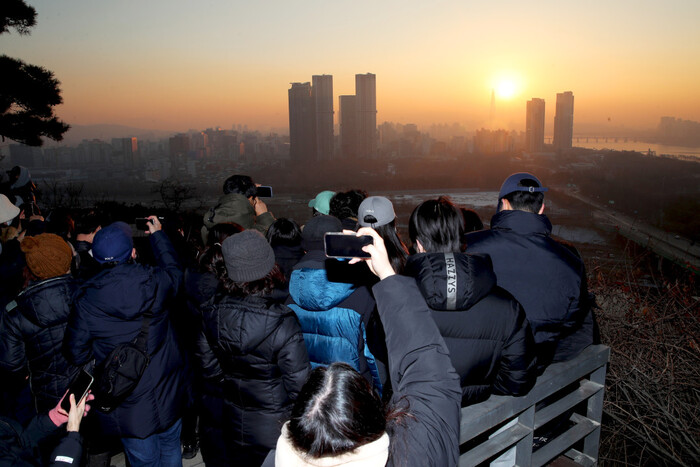 | ▲ 지난 2023년 응봉산 해맞이 축제에서 일출사진을 찍는 주민들의 모습 (사진=성동구청 제공) |