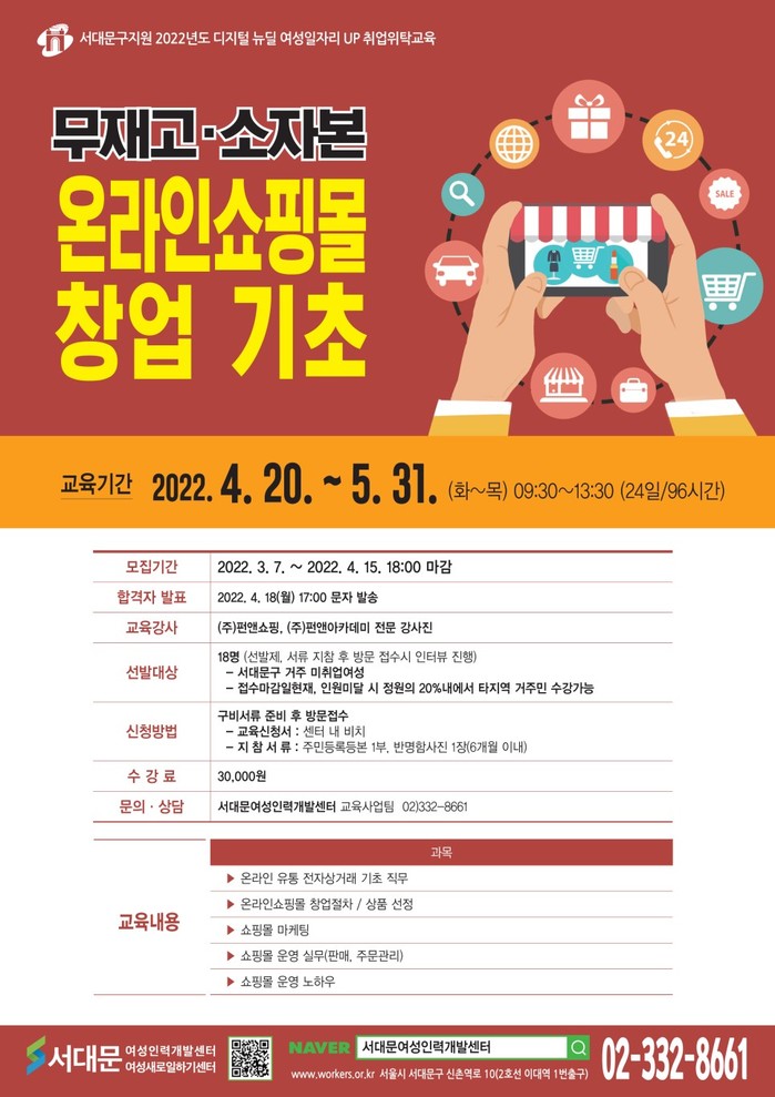 [시민일보 = 홍덕표 기자] 서울 서대문구(구청장 문석진)가 쇼핑몰 창업 희망 여성에게 ‘무재고·소자본 온라인 쇼핑몰 창업’ 기초 교육을 실시하고 창업까지 지원하는 원스톱 프로그램을 서대문여성인력개발센터에서 진행한다.
