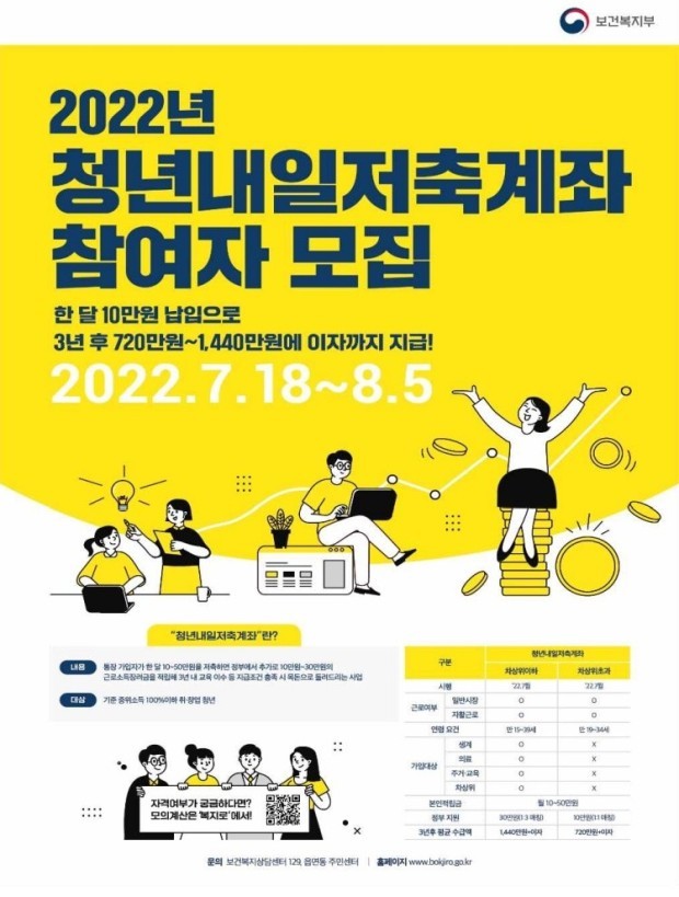 ‘청년내일저축계좌’ 신청 대상은 기초생활수급자(생계·의료·주거·교육급여), 차상위계층 및 기준 중위소득 100% 이하의 일하는 청년으로, 가구 소득·연령·근로 기준·가구 재산의 4개 조건이 모두 충족돼야 가입이 가능하다.