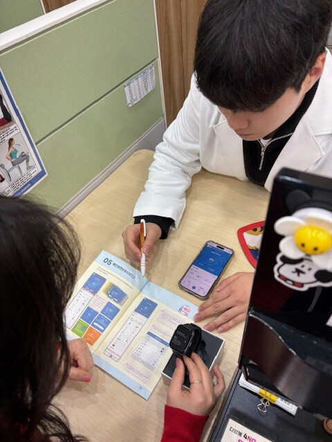 | ▲ 모바일 헬스케어사업 참여자가 모바일 앱(채움건강)과 활동량계(스마트밴드)에 대한 설명을 듣고 있다. (사진=구로구청 제공) |