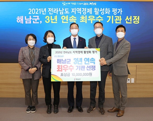 [해남=정찬남 기자] 전남 해남군(군수 명현관)이 전라남도에서 실시한 2021년 지역경제 활성화 평가결과 최우수상의 영예와 포상금 1,000만 원을 확보했다.