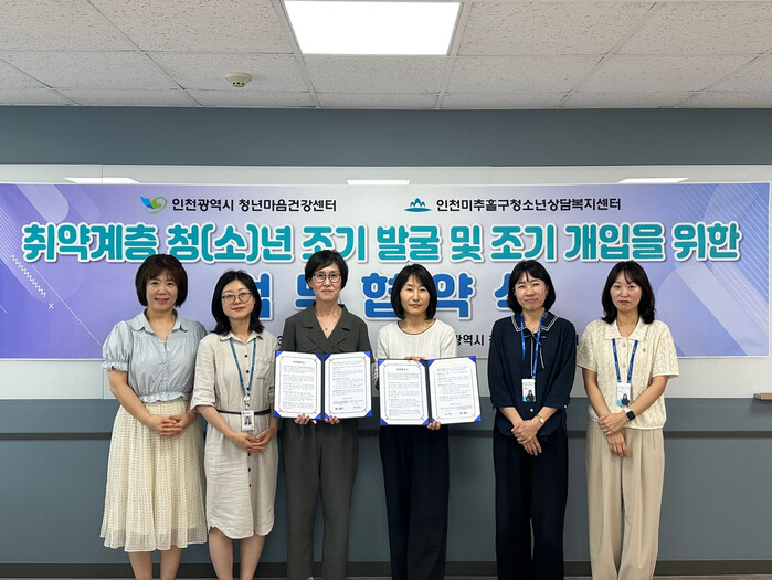 [인천=문찬식 기자] 인천 미추홀구(구청장 이영훈)는 23일, 청소년상담복지센터·학교밖청소년지원센터(센터장 최문주, 이하 센터)가 인천시청년마음건강센터와 청소년 정신건강 지원을 위한 업무협약을 체결했다고 밝혔다.