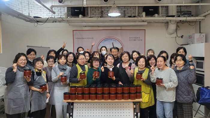 성동구 행당제2동 주민자치회가 최근 지역 주민과 함께하는 ‘전통고추장 담그기 체험’을 진행했다. 이번 프로그램은 주민 25명이 참여했으며, 우리 전통 방식으로 고추장을 직접 담그는 과정을 배우고 체험하는 시간을 보냈다. 사진은 체험에 참여한 주민들이 기념 촬영을 하는 모습. (사진=성동구청 제공)