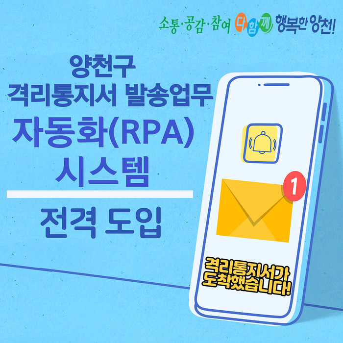 [시민일보 = 박준우 기자] 양천구(구청장 김수영)는 오는 3월2일부터 코로나19 격리통지서 발송업무에 ‘자동화(RPA) 시스템’을 도입한다고 28일 밝혔다.
