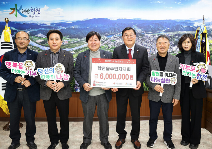 김윤철 합천군수는 “어려운 이웃들을 위하여 온정을 베풀어주신 합천읍주민자치회에 감사드리며, 소중한 성금은 꼭 필요한 이웃에게 전달될 수 있도록 하겠다.”고 감사의 마음을 전했다.