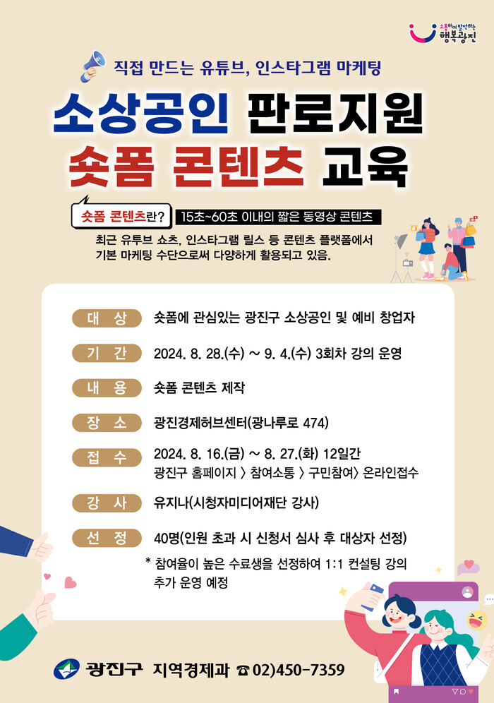 [시민일보 = 여영준 기자] 광진구(구청장 김경호)가 지역내 소상공인과 예비창업자의 판로개척을 돕고 마케팅 역량을 강화하기 위해 오는 28일~9월11일 ‘소상공인 판로지원 숏폼 콘텐츠 교육’을 실시한다.