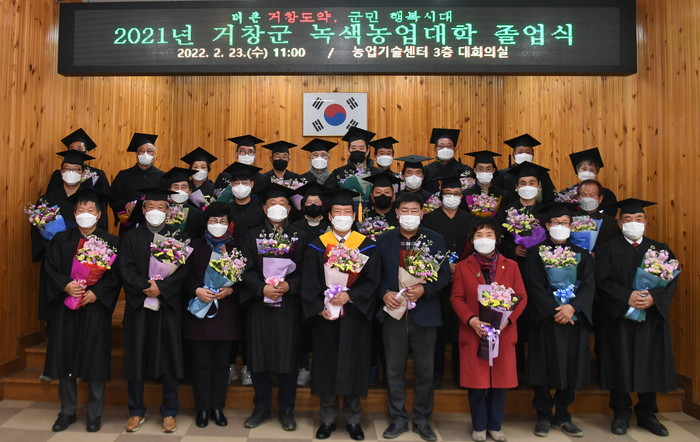 거창군은 23일 농업기술센터 3층 교육장에서 거창녹색농업대학장인 구인모 군수와 김종두 군의장을 비롯한 내빈 및 졸업생 40여 명이 참석한 가운데 2021년도 녹색농업대학 졸업식을 개최했다.