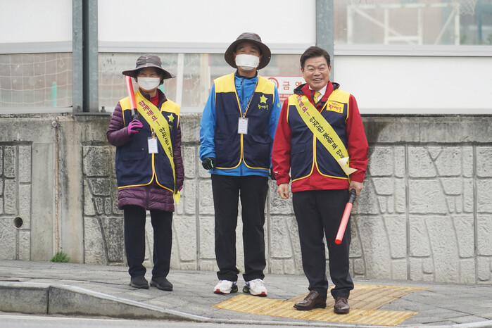 | ▲ 전농초등학교 인근 통학로에서 진행된 안전한 통학로 조성을 위한 민관경합동캠페인에 참여한 이필형 구청장(오른쪽)이 노인들과 함께 캠페인을 펼치고 있다. (사진=동대문구청 제공) |