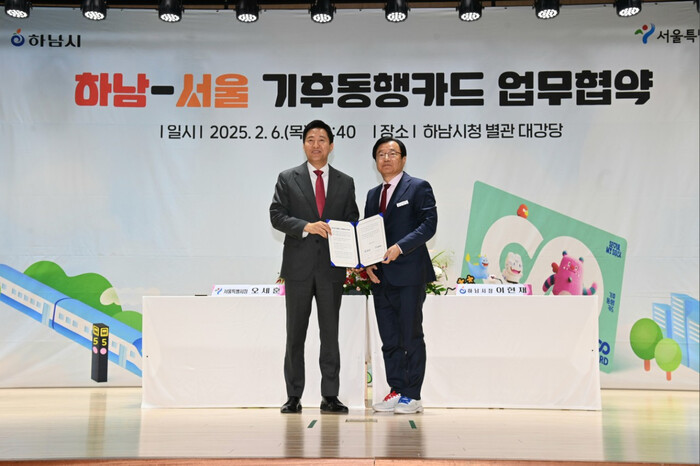 이현재 경기 하남시장이 최근 하남시청에서 오세훈 서울시장과 만나 ‘하남-서울 기후동행카드 사업참여를 위한 업무협약’을 체결했다. 이번 협약에 따라 지하철 5호선 하남 연장 구간인 미사역, 하남풍산역, 하남시청역, 하남검단산역 등 4개 역사를 이용하는 시민들은 향후 기후동행카드 이용 혜택을 받게 됐다. 사진은 협약식에서 이 시장(오른쪽)이 오 시장(왼쪽)과 기념촬영을 하는 모습. (사진=하남시청 제공)