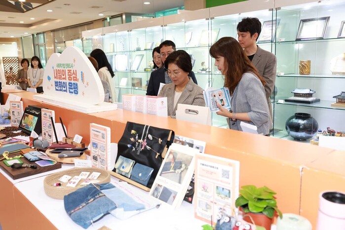 | ▲ 전시된 제품을 둘러보고 있는 김미경 구청장(가운데) |