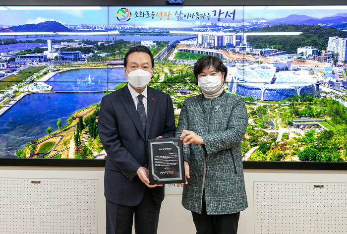 노현송 서울 강서구청장이 17일 ‘2021 복지구청장상’ 수상자로 선정됐다. 노 구청장은 지역사회 안전망 구축과 복지사각지대 해소를 위해 노력한 결과를 인정받아 본 상을 수상하게 됐다. 사진은 노 구청장(왼쪽)이 서울사회복지사협회 심정원 회장으로부터 복지구청장상을 전달받고 있는 모습. (사진제공=강서구청)
