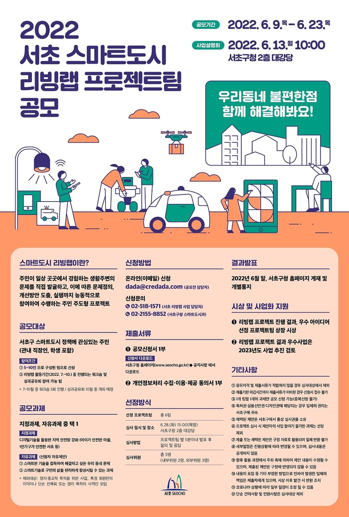 신청 희망자는 서초구청 홈페이지 공지사항의 신청서를 다운받아 이메일로 제출하고, 기타 자세한 사항은 서초 리빙랩 사업 담당처 또는 서초구청 스마트도시과로 문의하면 된다.