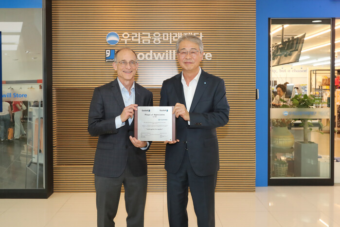 | ▲ 우리금융그룹 우리금융미래재단 임종룡 이사장(오른쪽)에게 스티븐 프레스턴 미국 굿윌스토어 대표이사(왼쪽)가 감사패를 전달하고 있다. (사진=우리금융 제공) |