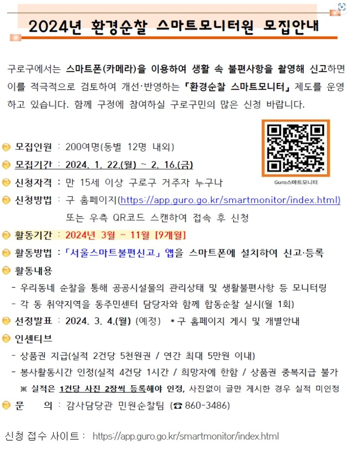 [시민일보 = 이대우 기자] 구로구(구청장 문헌일)가 오는 2월16일까지 ‘2024년 환경순찰 스마트모니터원’을 모집한다.