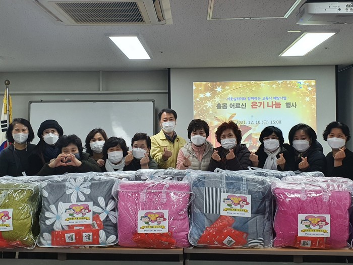 서울 광진구 중곡4동 주민센터는 ‘고독사 예방 이웃살피미 사업’의 일환으로 최근 ‘온기나눔 행사’를 진행했다. 이웃살피미들은 한파에 취약한 저소득 홀몸가구에 이불과 손난로를 전달하면서 안부를 확인했다. 사진은 전달식에서 관계자들이 기념촬영을 하는 모습. (사진제공=광진구청)