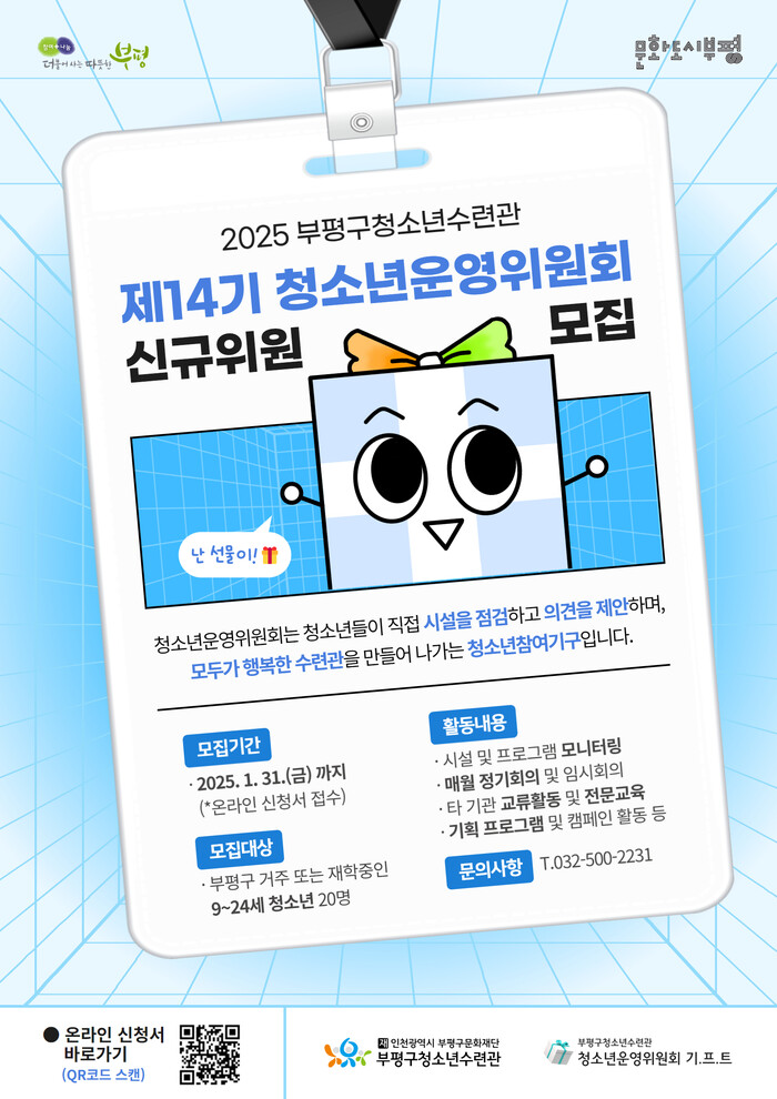 [인천=문찬식 기자] 인천 부평구(구청장 차준택) 청소년수련관은 오는 31일까지 2025년도 제14기 청소년운영위원회 ‘기.프.트’의 신규 위원을 모집한다고 밝혔다.