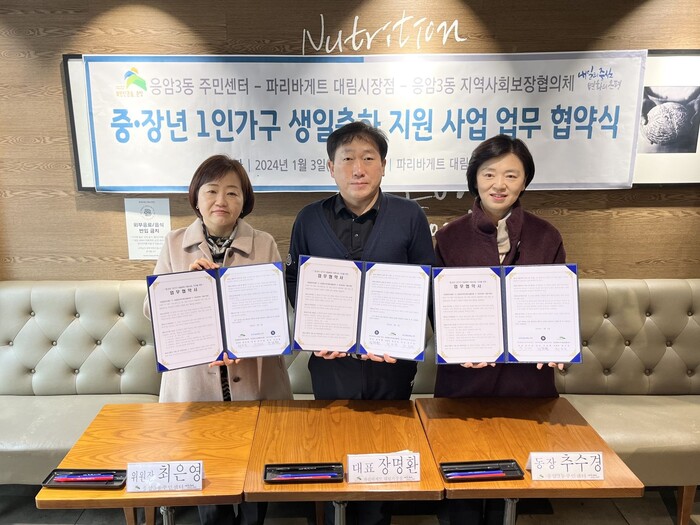 [시민일보 = 이대우 기자]서울 은평구(구청장 김미경) 응암3동은 지역사회보장협의체와 함께 3일 파리바게트 대림시장점과 중장년 1인가구 생일축하 지원 사업을 위한 업무협약을 체결했다고 밝혔다.