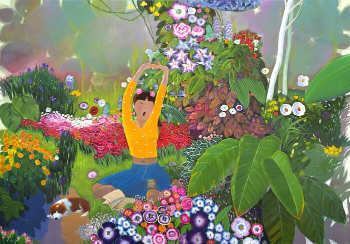 이존립 작가의 ‘정원’은 작가가 상상하고 추억하는 이상적인 자연의 모습이다. 실재하는 자연이 아니라 작가의 추억과 꿈이 만든 공간으로, 캔버스 속 사람들은 가장 편안한 곳에서 나무와 새, 꽃, 풀잎과 어우러지며 조화를 이룬다.