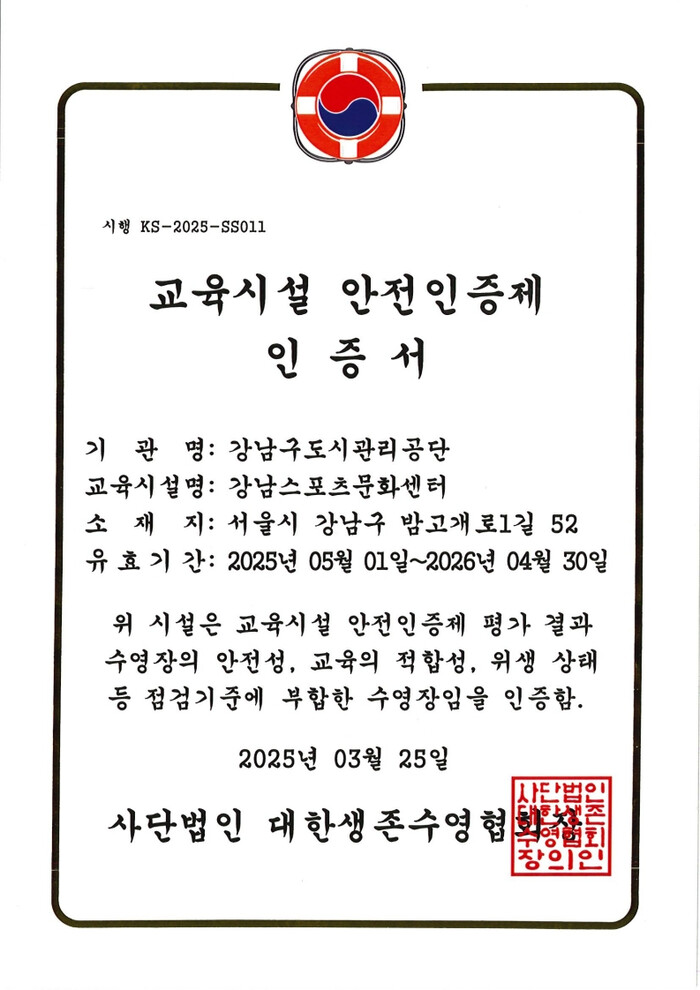 이는 사단법인 대한생존수영협회로부터 2021년 처음 안전인증을 받은 이후 5년 연속 갱신 달성한 것으로 강남스포츠문화센터 수영장의 안전성, 교육 적합성, 위생청결 상태, 안전 관련 기구 등이 안전하다고 평가한 결과이다.