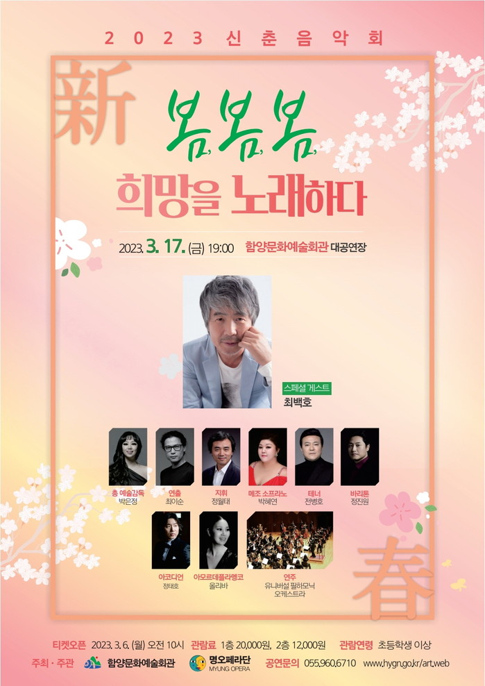 ‘봄,봄,봄 희망을 노래하다’는 유럽과 미국 등 최고 명문음대 출신의 최정상급 연주자로 구성된 유니버셜 필하모닉오케스트라와 협연으로 오페라와 팝, 영화음악, 가요가 어우러져 새봄을 맞이하는 군민들에게 코로나19로 그동안 움츠려있던 마음을 열고 희망과 용기를 심어주고자 기획하였다.
