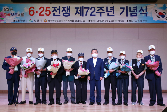 밀양시는 24일 시청 대강당에서 박일호 시장을 비롯한 6.25 참전유공자, 보훈가족, 보훈단체장, 관내 기관·사회단체장 등 400여 명이 참석한 가운데 6.25전쟁 제72주년 기념식을 가졌다.