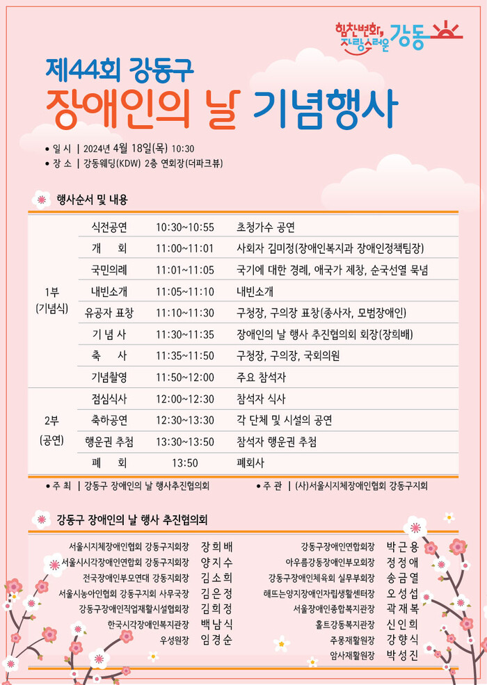[시민일보 = 이대우 기자] 서울 강동구(이수희 구청장)가 ‘제44회 장애인의 날’을 기념해 오는 18일 강동웨딩KDW(천호대로 1102)에서 기념행사를 개최한다고 밝혔다.