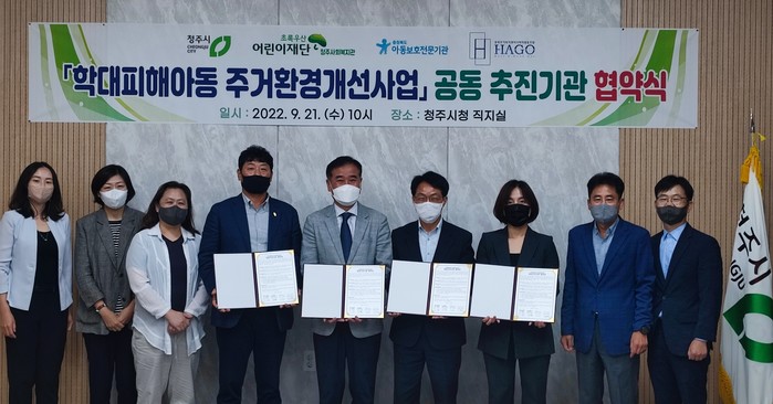 이날 협약식에는 오세동 청주시 부시장, 최은희 충북아동보호전문기관장, 김석호 청주사회복지관장, 김덕수 충북주거복지센터사회적협동조합장이 참석했다.