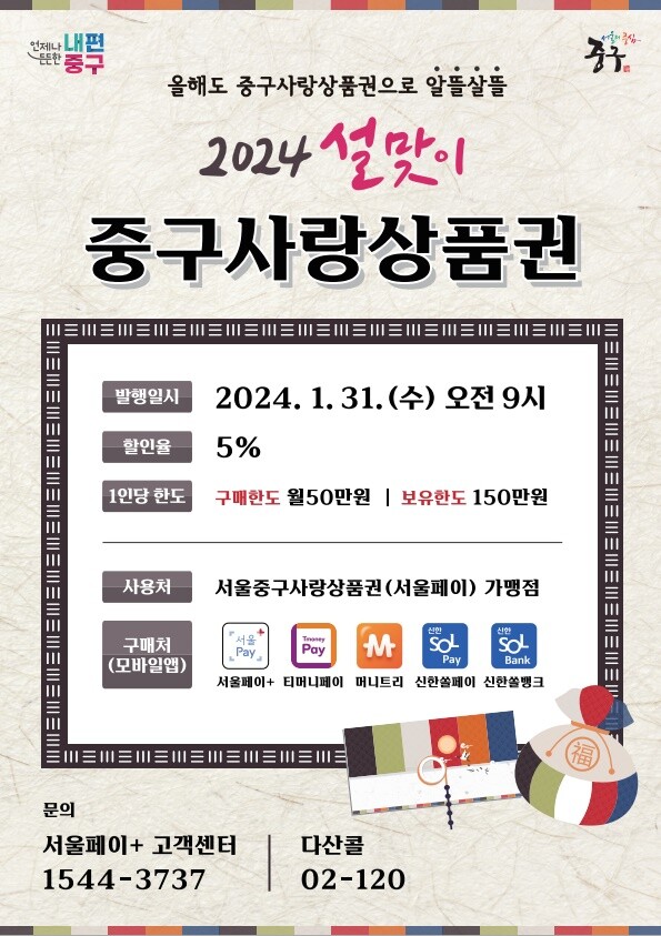 [시민일보 = 여영준 기자] 중구(구청장 김길성)는 설날을 맞아 40억원 규모의 ‘서울중구사랑상품권’을 5% 할인된 금액으로 판매한다고 25일 밝혔다.