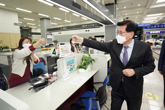 유덕열 서울 동대문구청장은 17일 코로나19로 인한 업무 가중으로 지친 민원공무원의 마음을 다독이기 위해 일일 DJ로 변신해 민원공무원들의 사연을 받아 읽어주고 공감과 격려의 답변을 건네며 위로했다. 사진은 유 구청장(오른쪽)이 사연을 보낸 민원공무원을 응원하고 있는 모습. (사진제공=동대문구청)