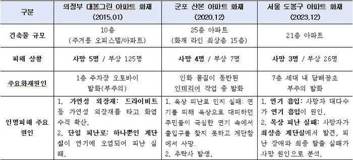 최근 국내에서 발생한 주요 아파트 화재 사망 사고 사례들을 보면, 시설이나 관계 제도의 문제와 더불어 대형 인명피해를 키운 주요 원인으로 연기의 급속한 확산과 피난로 확보의 실패라는 상황적 요인도 있었음을 명확히 알 수 있습니다.