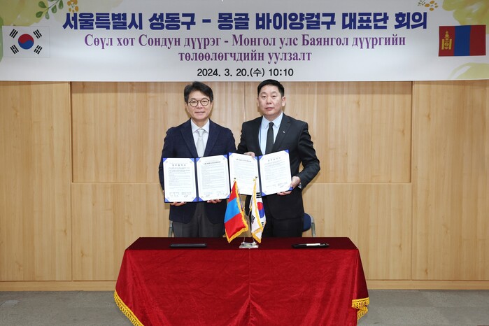 [시민일보 = 이대우 기자] 성동구(구청장 정원오)는 국외 자매도시인 몽골 울란바토르시 바이양걸구 대표단(이하 대표단)이 구청을 공식 방문해 업무협약 체결, 벤치 마킹 등 다양한 교류를 했다고 8일 밝혔다.