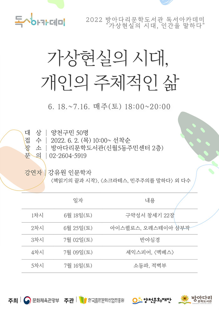 방아다리문학도서관의 ‘독서 아카데미’는 '가상현실의 시대, 인간을 말하다'를 주제로 6월 18일부터 매주 토요일 총 15회의 릴레이 강연을 이어간다. 강연자로는 ▲강유원 박사 ▲이은수 카이스트 조교수 ▲권석만 서울대학교 교수가 나선다. 양천구민을 대상으로 2일부터 선착순 수강생을 모집하며, 접수방법은 방아다리문학도서관으로 문의하면 된다.