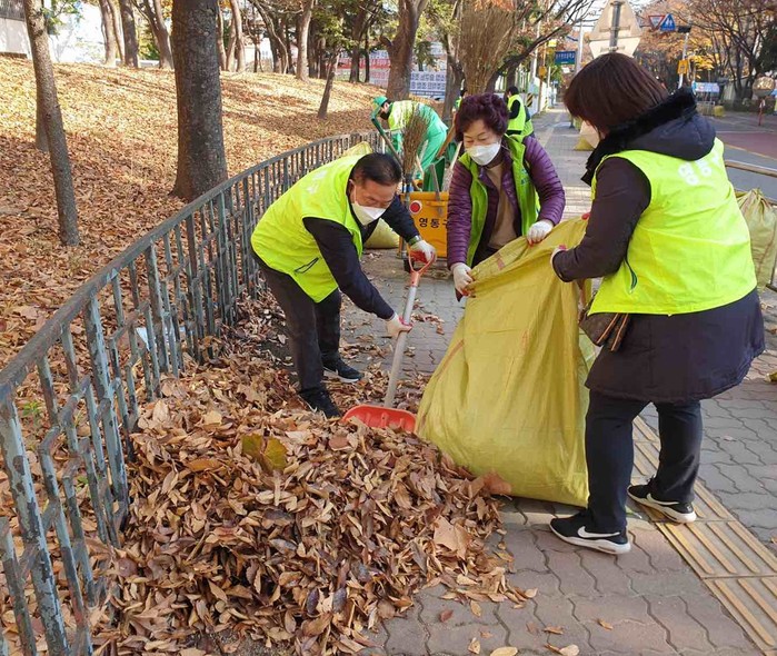 경기 수원시 영통구 매탄1동 행정복지센터는 17일 통장협의회 회원들과 환경관리원, 관계 공무원 등 30여명이 참여한 가운데 인계로189번길, 동수원초등학교 통학로 등 약 1km 구간 가로수 밀집지역을 중점으로 도로변 가을철 낙엽 대청소를 실시했다. 사진은 참여자들이 낙엽을 쓸고 있는 모습. (사진제공=영통구청)
