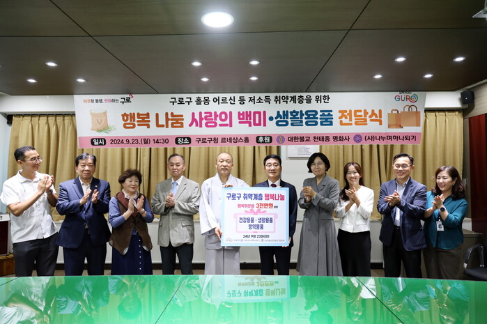 구로구가 23일 구청 르네상스홀에서 대한불교천태종 (사)나누며 하나되기와 함께 취약계층을 위한 ‘행복나눔 사랑의 백미·생활용품 전달식’ 행사를 개최했다. 사진은 전달식에 참석한 문헌일 구청장(왼쪽 여섯 번째)이 기념 촬영하는 모습. (사진=구로구청 제공)