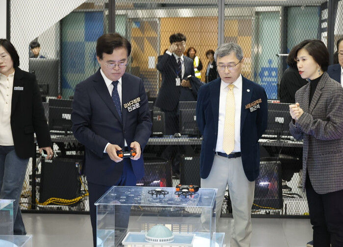 진교훈 강서구청장이 최근 마곡광장에 위치한 4차산업 혁신기술 체험센터 ‘서울퓨처랩’을 방문해 정근식 서울시교육감과 함께 가상 공간에서 건물과 물건을 자유자재로 배치해 보는 ‘MR(혼합현실) 홀로렌즈’, 드론비행 등을 체험했다. 사진은 진 구청장(왼쪽)이 드론 비행을 체험하는 모습. (사진=강서구청 제공)