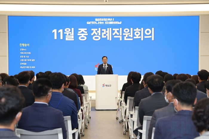 | ▲ 명현관 해남군수가 14일 해남군청에서 11월 정례조회를 주재하며 13일 막을 내린 해남미남축제 기간 동안 이용객들의 안전을 위해 노력해 준 공직자들에게 노고를 치하하고 중대재해예방법 시행의 중요성을 강조하고 있다. / 사진=해남군 제공 |