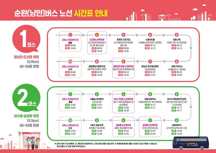 구는 이번 순환 셔틀버스 운행을 통해 성동구 내 시립 및 구립 노인복지관, 관공서, 지하철역 등 주요 거점지역을 경유하여 어르신들이 안전하고 편리하게 이동할 수 있도록 도울 예정이다.
