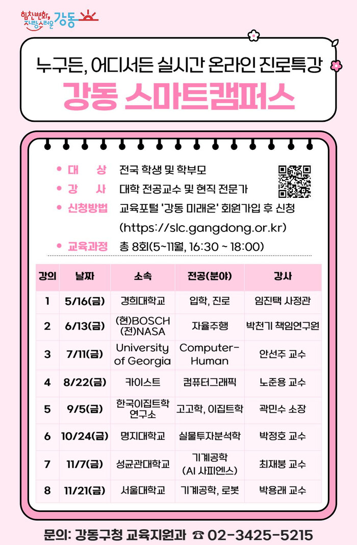 ‘2025 강동 스마트캠퍼스’는 학부모, 중학생 등 일반 주민들도 ‘강동 미래온’에서 회차별로 사전 신청 후 실시간으로 청강할 수 있다. 경희대학교 임진택 입학사정관이 입학·진로를 주제로 진행하는 1회차(16일)에 청강을 희망하는 경우 오는 14일까지 신청하면 된다.