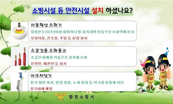조형용 소방서장은 "자동확산 소화기나 소공간용 소화용구, 아크차단기 등의 안전시설은 초기 화재 대응에 효과적"이라며 "화재예방은 작은 관심부터 실천이 된다며, 군민들의 작은 노력이 대형화재를 예방 할수 있다"고 말했다.