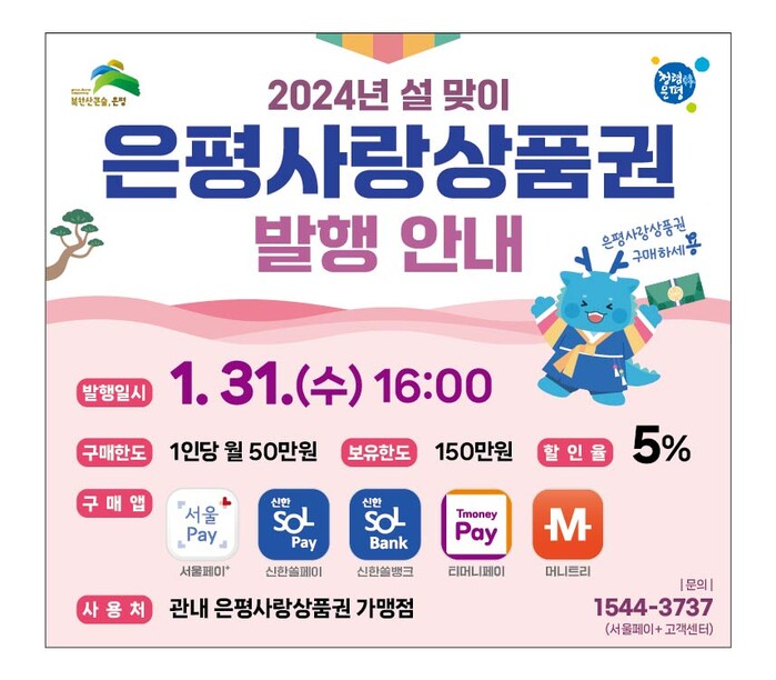 [시민일보 = 이대우 기자] 은평구(구청장 김미경)가 설 명절을 앞두고 오는 31일 오후 4시부터 은평사랑상품권 40억원을 발행한다.