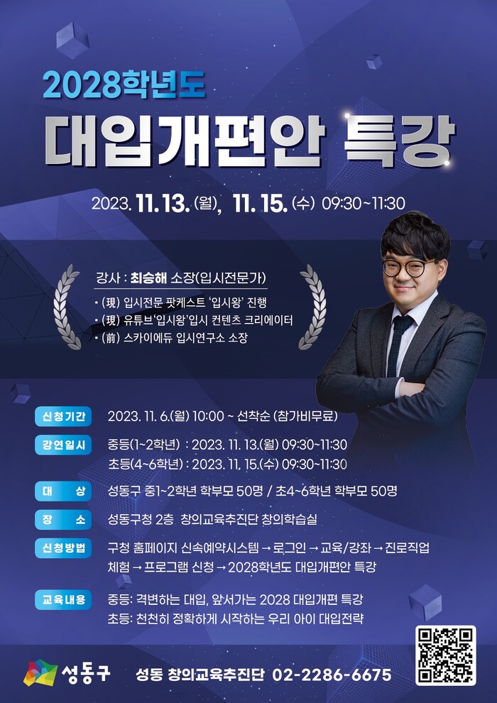 [시민일보 = 홍덕표 기자] 서울 성동구(구청장 정원오) 창의교육추진단은 지역내 초등 고학년, 중학교 1~2학년 학부모를 대상으로 2028학년도 대입개편안 특강을 개최한다.
