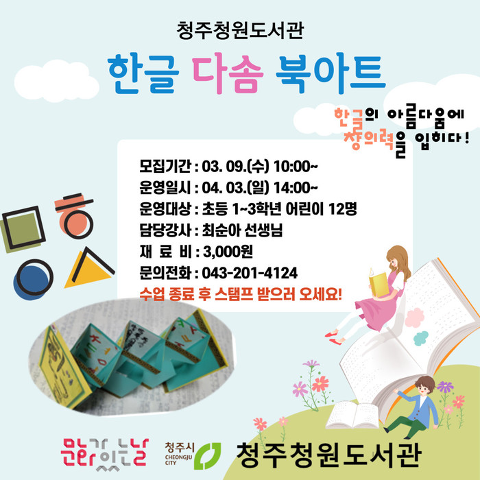 청주청원도서관이 3월 문화가 있는 날 프로그램으로 『한글 다솜 북아트』를 운영한다.