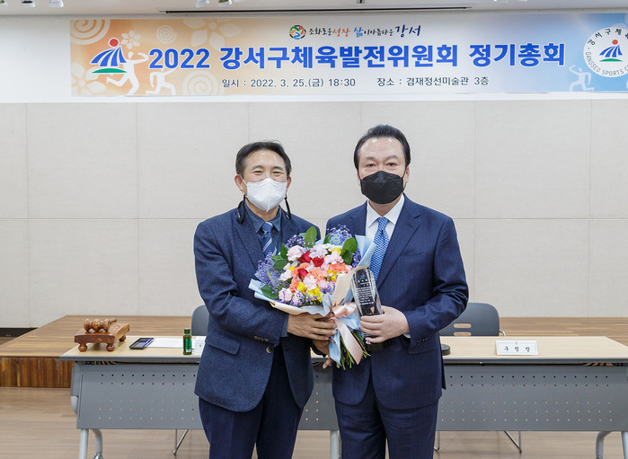 노현송 서울 강서구청장이 최근 강서구체육발전위원회 정기총회에서 엘리트 체육인 양성과 지역 체육발전에 기여한 공로를 인정받아 위원회로부터 감사패를 전달받았다. 사진은 노 구청장(오른쪽)이 고건상 강서구체육발전위원회 회장으로부터 감사패를 전달받고 기념촬영을 하고 있는 모습. (사진제공=강서구청)