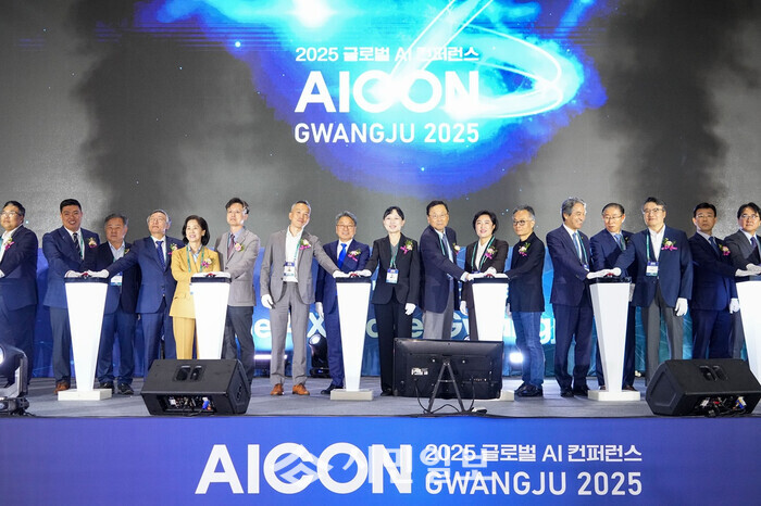 | ▲ 강기정 광주광역시장(왼 쪽부터 8번)이 15일 오전 서구 김대중컨벤션센터에서 열린 '글로벌AI컨퍼런스 아이콘(AICON) 광주 2025' 개막식에 참석해 내빈들과 개막 퍼포먼스를 하고 있다./광주광역시 제공 |