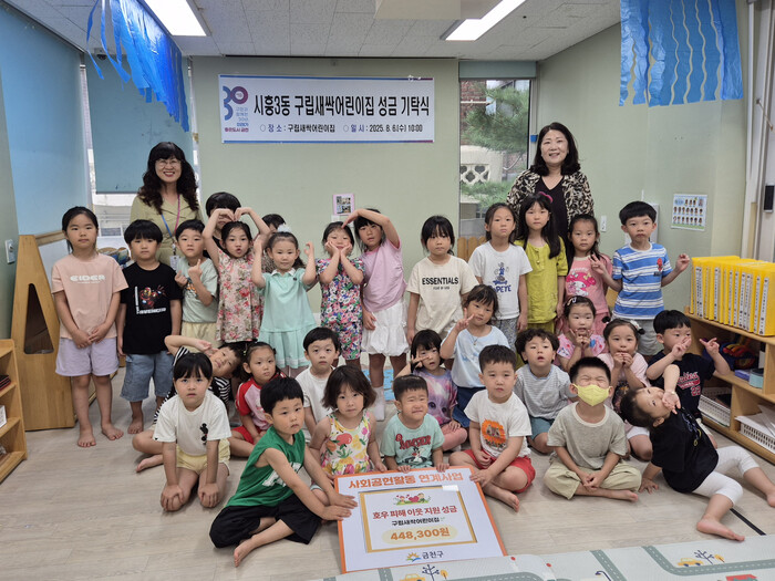 6일 금천구 시흥3동에 소재한 구립새싹어린이집이 어린이집 원아와 학부모 및 교직원이 함께 모은 후원금 44만8300원을 시흥3동 주민센터에 기탁했다. 사진은 기탁식에 참석한 원아 및 관계자들이 기념촬영을 하고 있는 모습. (사진=금천구청 제공)
