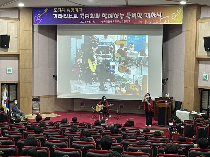 한국교원대부설고는 여름의 무더위와 학업에 지친 학생을 위해 ‘도전은 희망이다’라는 주제로, 꿈과 희망을 전하는 김지희 기타리스트와 함께하는 특별한 시간을 마련한 것이다.