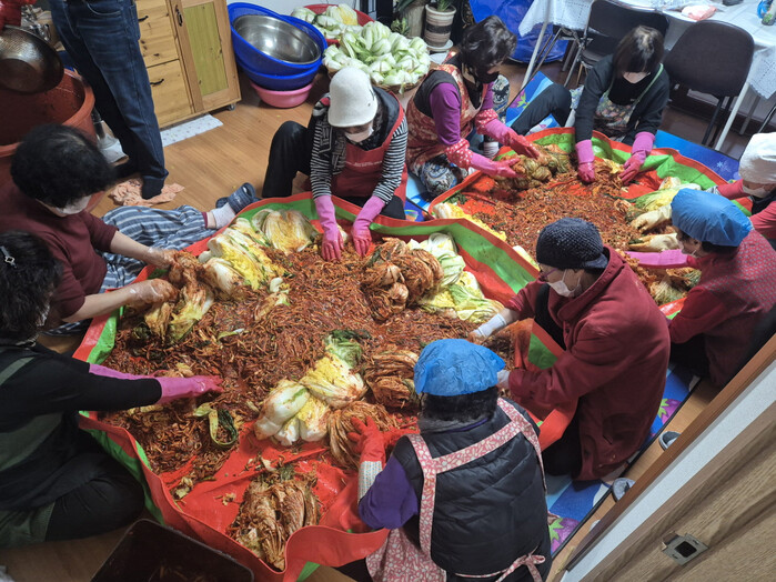 | ▲ 시흥4동 한울경로당에서 어르신들이 김장을 담그고 있다. (사진=금천구청 제공) |