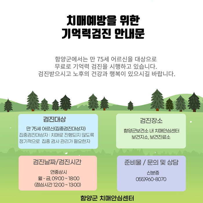 함양군보건소 치매안심센터는 만 75세 진입 어르신을 대상으로 치매조기검진을 집중 실시한다.